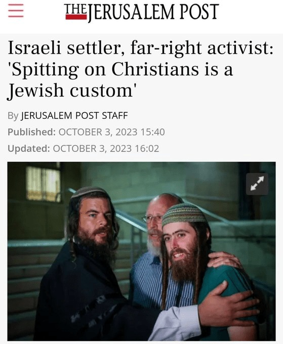 Νωρίτερα σύμφωνα με την Jerusalem Post, το φτύσιμο των Χριστιανών (και κοντά στις εκκλησίες και τα μοναστήρια τους) είναι μια «εβραϊκή παράδοση», σε σχέση με πρόσφατα γεγονότα όπου οι Ορθόδοξοι Εβραίοι φτύνουν χριστιανούς προσκυνητές.