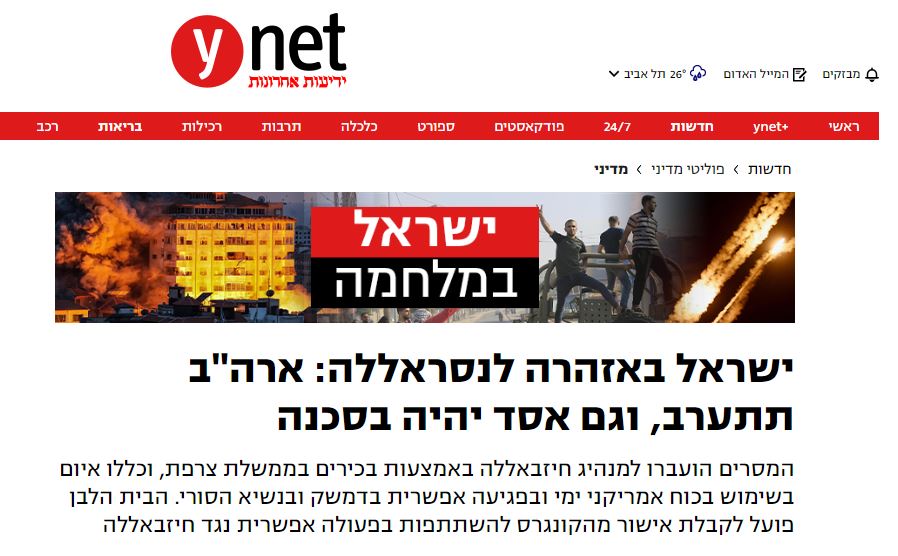 ”Το Ισραήλ προειδοποιεί τον Νασράλα: οι ΗΠΑ θα επέμβουν και ο Άσαντ θα βρίσκεται επίσης σε κίνδυνο’‘ αναφέρει ο τίτλος της ισραηλινής ynet. Kαι προσθέτει: