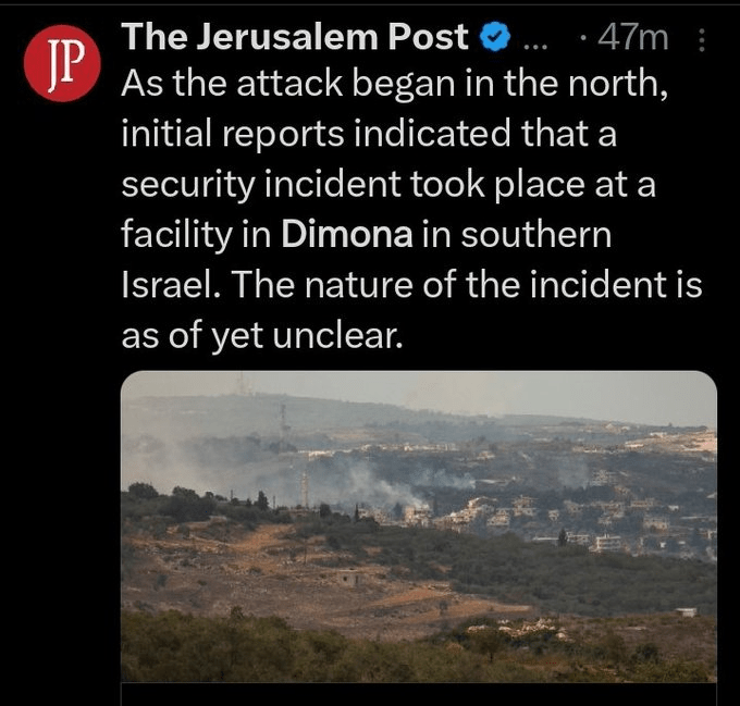 (Κανάλι 12 του Ισραήλ) - Καθώς ξεκίνησε η επίθεση στο βορρά, οι αρχικές αναφορές ανέφεραν ότι ένα περιστατικό ασφαλείας σημειώθηκε σε μια εγκατάσταση στη Ντιμόνα στο νότιο Ισραήλ. Η φύση του περιστατικού είναι μέχρι στιγμής ασαφής.jp