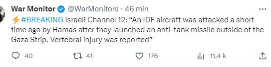 Ισραηλινό Κανάλι 12: «Ένα αεροσκάφος του ισραηλινού στρατού IDF δέχτηκε επίθεση πριν από λίγο από τη Χαμάς αφού εκτόξευσε έναν αντιαρματικό πύραυλο έξω από τη Λωρίδα της Γάζας. Αναφέρθηκε ότι επλήγη στη ράχη του».