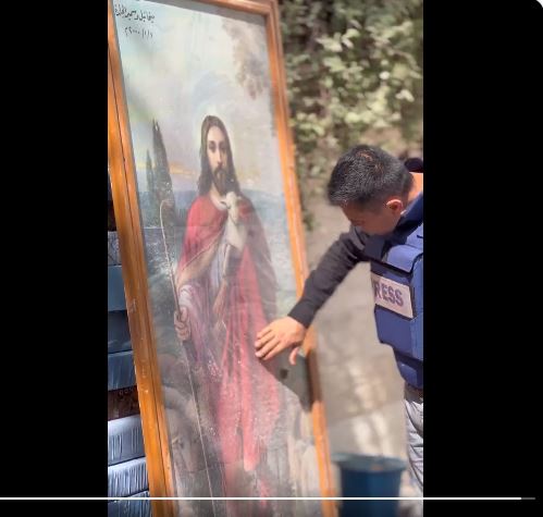 ”Μπροστά από την εικόνα στην εκκλησία του Αγίου Πορφυρίου που γλίτωσε από την έκρηξη.” λέει ο διακεκριμένος δημοσιογράφος Saed Al-Suwerki. Πρόκειται για μια καταπληκτική εικόνα με ολόσωμο Ιησού ως καλό ποιμένα που φέρει στους κόλπους του αμνό. Επίσης ο αμνός εδώ ταυτίζεται με το πρόσωπο του Θεάνθρωπου ως ο αμνός του Θεού ”Ίδε ό αμνός του Θεού ό αϊρων την άμαρτίαν του κόσμου”….
