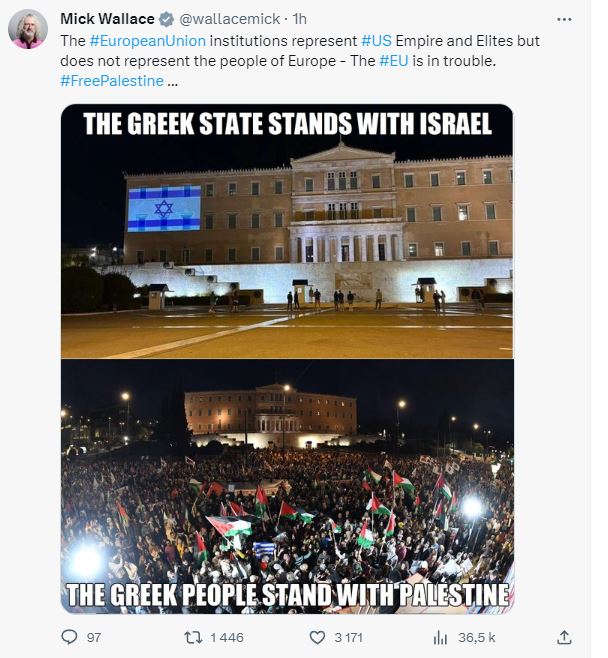 Πριν από λίγο ο Ιρλανδός Ευρωβουλευτής Mick Wallace βάζει σε κοντράστ τις φωτογραφίες από Βουλή Ελλάδας με στάμπα σημαία Ισραήλ ( υπό ξένη σημαία) και λεζάντα ”το ελληνικό κράτος είναι με το Ισραήλ” και από Σύνταγμα όπου ο ελληνικός λαός διαδηλώνει υπέρ της Παλαιστίνης με λεζάντα ”ο ελληνικός λαός είναι με την Παλαιστίνη” και σχολιάζει την αντινομία: ”Οι θεσμοί της ΕΕ αντιπροσωπεύουν την Αυτοκρατορία των ΗΠΑ και τις Ελίτ αλλά δεν αντιπροσωπεύουν τους λαούς της Ευρώπης. Η ΕΕ είναι σε ταραχή.”