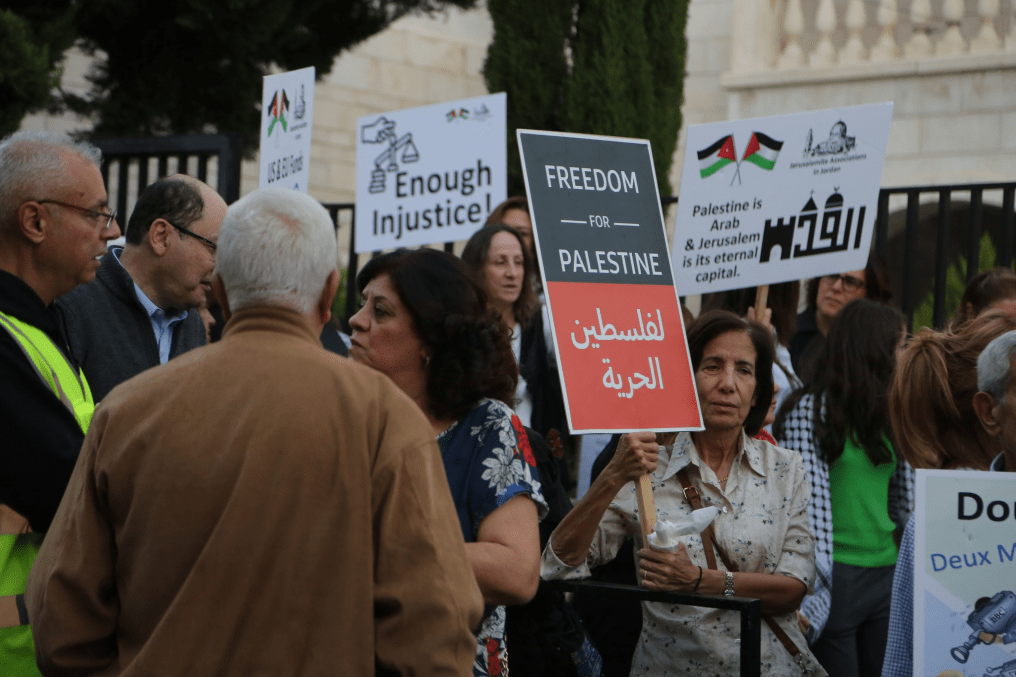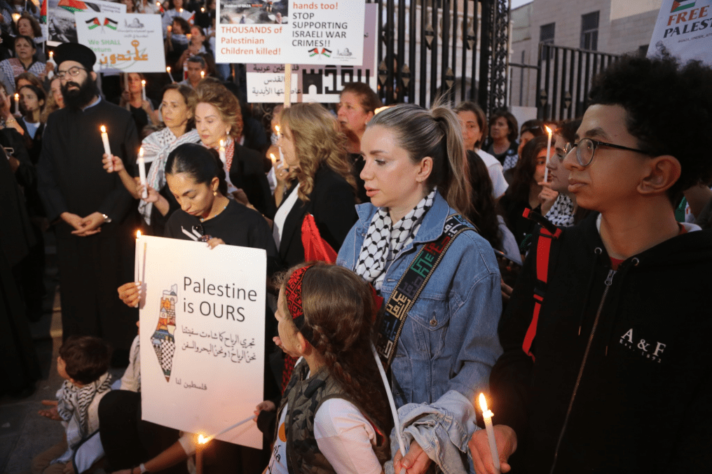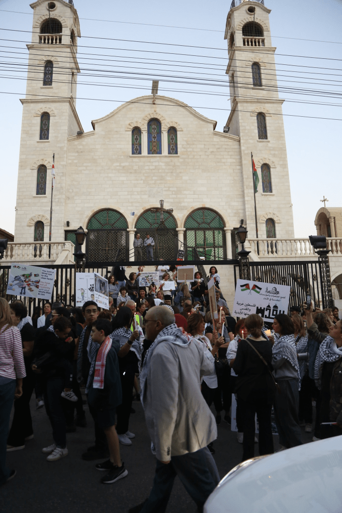 Εκατοντάδες Ορθόδοξοι συμμετείχαν σε διαδήλωση που διοργάνωσαν σήμερα το απόγευμα μπροστά από τον Καθεδρικό Ναό της θριαμβευτικής Εισόδου του Κυρίου στο Sweifieh στην Ιορδανία, κατά την οποία εξέφρασαν την αλληλεγγύη τους στον λαό στη Λωρίδα της Γάζας και την καταδίκη τους για τις εγκληματικές πράξεις. Συνθήματα: λευτεριά στην Παλαιστίνη, χιλιάδες παιδιά της Παλαιστίνης σκοτώθηκαν, αρκετά με την αδικία…