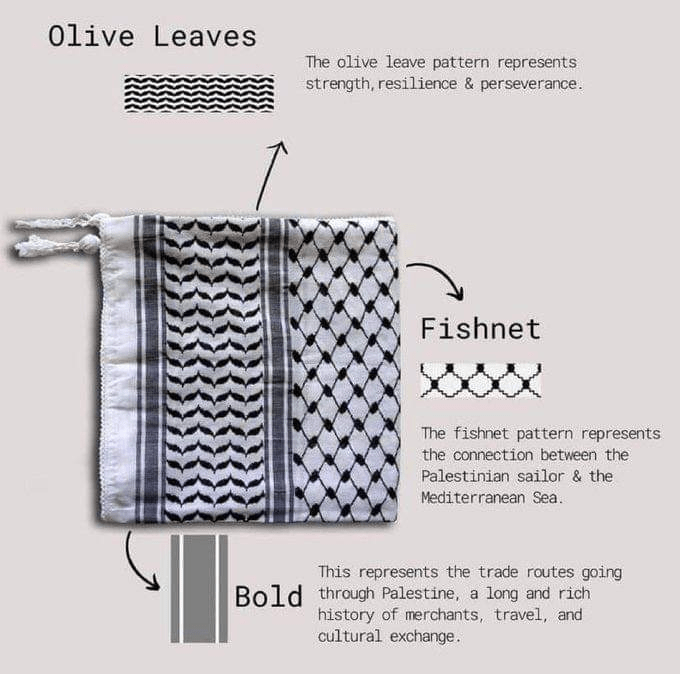 H Παλαιστινιακή μαντήλα έχει μια σειρά με φύλλα ελιάς μια σειρά με δίχτυα ψαράδων και μια λωρίδα που παραπέμπει στους δρόμους του εμπορίου..