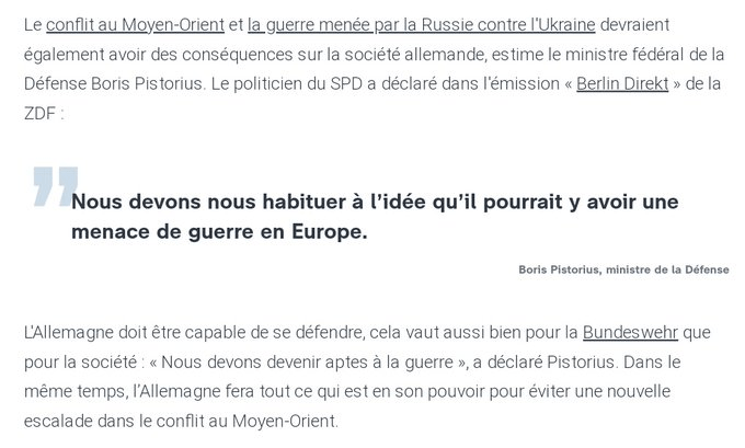 Η διαμάχη στη Μέση Ανατολή και στην Ουκρανία θα όφειλαν να έχουν συνέπειες στη γερμανική κοινωνία εκτιμά ο Γερμανός υπουργός Άμυνας Boris Pistorius. Προειδοποιεί για «απειλή πολέμου στην Ευρώπη» και καλεί τον στρατό και την κοινωνία να προετοιμαστούν για αυτό το ενδεχόμενο σε Συνέντευξη του στην εκπομπή Berlin Direkt στην ZDF..Δήλωσε ότι ”οφείλουμε να συνηθίσουμε στην ιδέα ότι θα μπορούσαμε να έχουμε μια απειλή πολέμου στην Ευρώπη”. ”Θα πρέπει να ετοιμαστούμε για πόλεμο” είπε.