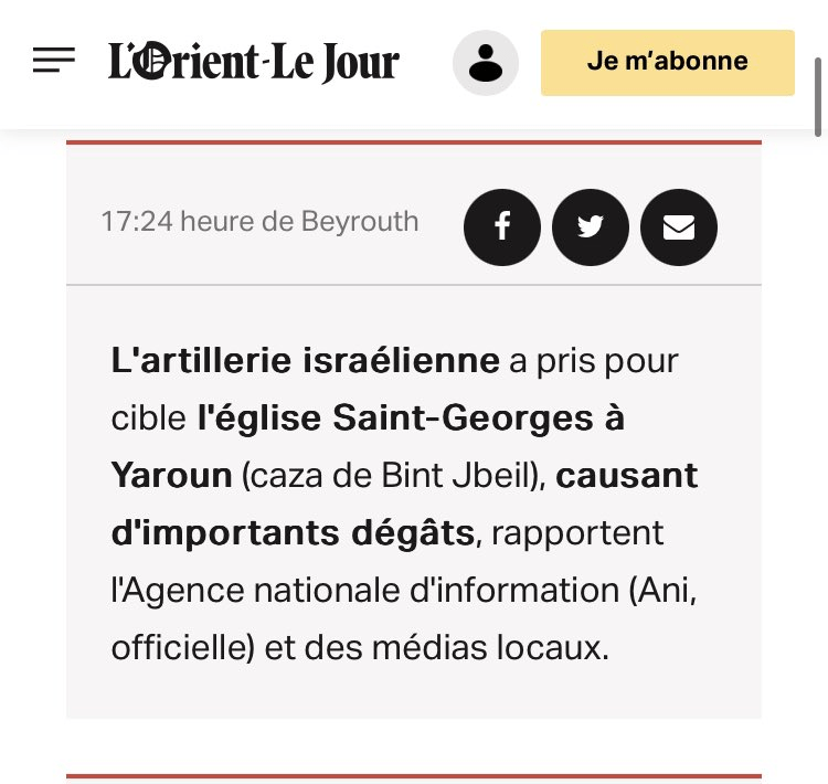 Ο ισραηλινός στρατός βομβάρδισε χθες την εκκλησία του Αγίου Γεωργίου στην πόλη Γιαρούν/ Yaroun ( Bint Jbeil) στο νότιο Λίβανο.. To γαλλόφωνο μέσο L’ Orient le Jour δημοσιεύει την είδηση όπως και πολλές άλλες πηγές. Το μέσο αναφέρει ότι στις 20 Νοεμβρίου 2023 το ισραηλινό πυροβολικό στόχευσε την εκκλησία το Αγίου Γεωργίου στο Yaroun ( Bint Jbeil) προκαλώντας υλικές ζημιές μεταφέρει το κρατικό πρακτορείο του Λιβάνου ANI και τοπικά μίντια.