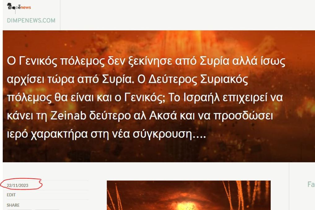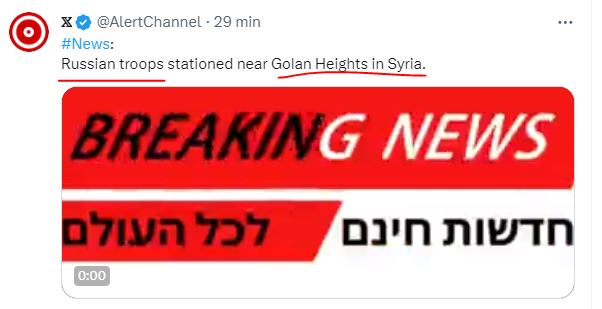 Τώρα υπάρχει αυτή η πληροφορία. Ρωσικός στρατός έλαβε θέσεις πλησίον Γκολάν στα σύνορα με Ισραήλ:”Ρωσικά στρατεύματα στρατοπέδευσαν κοντά στα υψώματα του Γκολάν στη Συρία” δηλ. στα σύνορα με Ισραήλ. Eπιτηρούν, επαγρυπνούν και παίρνουν θέσεις.. Αν ισχύει τότε αυτό που είπαμε μόλις χθες αρχίζει να διαφαίνεται ήδη..το τρομερό σενάριο του Δεύτερου Συριακού Πολέμου που ίσως να είναι και ο Γενικός Πόλεμος.