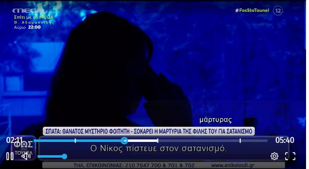 Η σοκαριστική μαρτυρία της φίλης του 19χρονου (Video εκπομπής Mega «Φως στο Τούνελ»: O Νίκος πίστευε στο Σατανισμό.. του άρεσε η μαγεία γενικά τα παραφυσικά τα extra τα είχε σαν χόμπι τα έκανε για πλάκα δεν ήταν ότι θα σκότωνε και άνθρωπο. Eγώ ένιωθα πολύ κομπλέ γιατί ο καθένας πιστεύει ό,τι θέλει ( σσ δυστυχώς αυτή είναι και η κρατική αντίληψη δικαιική αντίληψη η λατρεία του Σατανά είναι ελεύθερη στην αποικία Ελλάδα) και δεν μπορούμε να τον αναγκάσουμε κιόλας να πιστέψει κάτι που θέλουμε εμείς και επειδή ξέρω ότι σε αυτήν την κοινωνία πολλά παιδιά πιστεύουν στο Σατανισμό ”