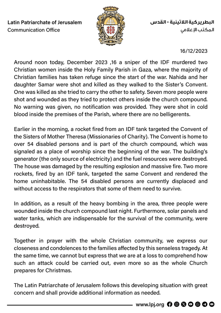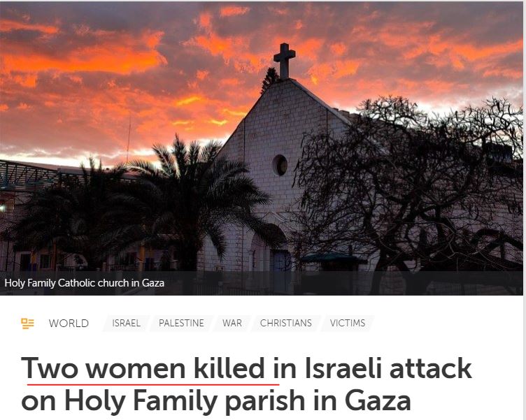 ”Σήμερα νωρίς το πρωί ένας ισραηλινός sniper σκότωσε 2 χριστιανές γυναίκες στο εσωτερικό της ενορίας της Αγ. Οικογένειας στη Γάζα όπου η πλειοψηφία των χριστιανικών οικογενειών βρήκε καταφύγιο από την αρχή του πολέμου” αναφέρει το δελτίο τύπου του καθολικού πατριαρχείου Ιεροσολύμων.
