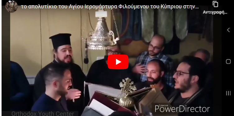 Το απολυτίκιο του Αγίου Ιερομάρτυρα Φιλούμενου του Κύπριου στην Αραβική από Αγιοταφίτικη χορωδία στην Παλαιστίνη στην Δυτική Όχθη φέτος στην γιορτή του στις 29 Νοεμβρίου κι εν μέσω πολέμου. Ψάλει Άραβας ιερομόναχος ο π. Γεώργιος που σπούδασε Βυζαντινή Μουσική και Θεολογία στην Αθήνα και γηγενείς Ορθόδοξοι Παλαιστίνιοι χριστιανοί σε μέρος στ΄ανατολικά της Βηθλεέμ.….