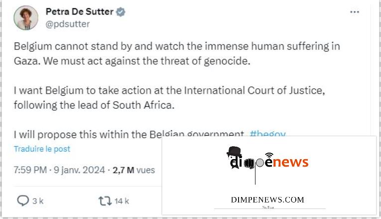 « Το Βέλγιο δεν μπορεί να παραμείνει με σταυρωμένα τα χέρια μπροστά στις τεράστιες ανθρώπινες οδύνες στη Γάζα. Οφείλουμε ν΄αντιδράσουμε κατά της απειλής Γενοκτονίας. Εύχομαι το Βέλγιο να αντιδράσει ενώπιον του Διεθνούς Δικαστηρίου (CIJ).Θα το προτείνω στη βελγική κυβέρνηση» δήλωσε η Αντιπρόεδρος του Βελγίου. Αναλυτικά το twitter της: