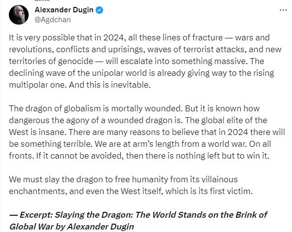 Ο δράκος της παγκοσμιοποίησης είναι θανάσιμα πληγωμένος. Είναι όμως γνωστό πόσο επικίνδυνη είναι η αγωνία ενός πληγωμένου δράκου. Η παγκόσμια ελίτ της Δύσης είναι τρελή. Υπάρχουν πολλοί λόγοι να πιστεύουμε ότι το 2024 θα υπάρξει κάτι τρομερό. Είμαστε σε απόσταση αναπνοής από έναν παγκόσμιο πόλεμο. Σε όλα τα μέτωπα. Αν δεν μπορεί να αποφευχθεί, τότε δεν μένει τίποτα άλλο παρά να τον κερδίσουμε.