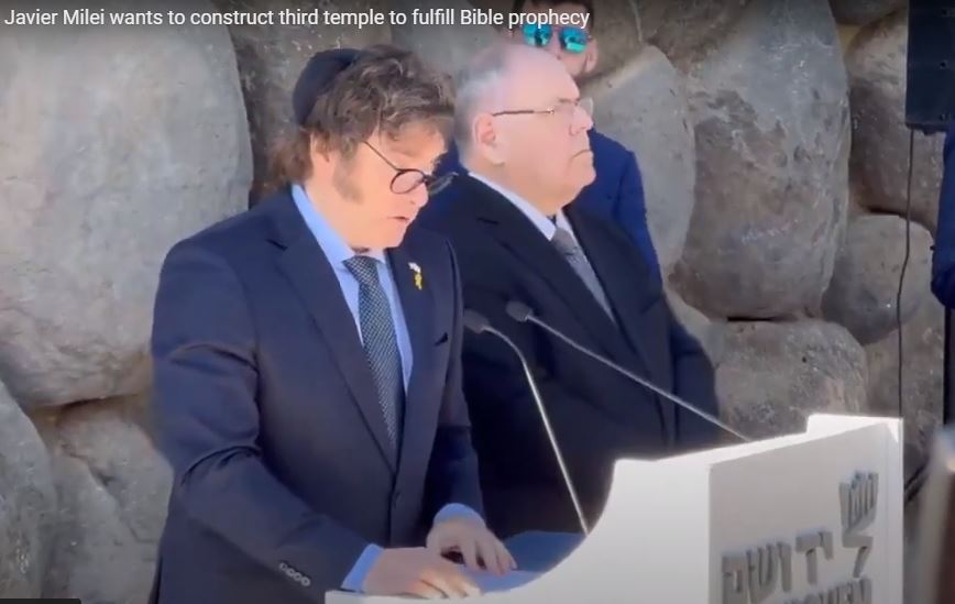 Στην Ιερουσαλήμ, ο Πρόεδρος της Αργεντινής Μιλέι/Milei είπε ότι ήθελε να δει την ανοικοδόμηση του Τρίτου Εβραϊκού Ναού, για να εκπληρωθεί όπως είπε η ”προφητεία” που ουσιαστικά θα φέρει τον ψευδομεσσία δηλ. τον Αντίχριστο στη Γη. Οι Εβραίοι δεν αποδέχονται ότι ο Χριστός είναι ο Μεσσίας τον θεωρούν επίσημα ψευδοπροφήτη και αναμένουν την εκπλήρωση των βιβλικών προφητειών περί ελεύσεως του Μεσσία σε άλλο πρόσωπο..