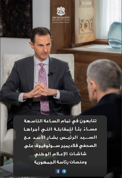 Ο Νο 1 Ρώσος δημοσιογράφος Vladimir Soloviev πήρε συνέντευξη από τον Bashar al-Assad που θα μεταδοθεί ολόκληρη αργότερα σήμερα στην εκπομπή του ”Soloviev LIVE” . Σε μια αποσπασματική προεπισκόπηση που ανεβάζει ο δημοσιογράφοςo Πρόεδρος Συρίας εμφανίζεται να μιλάει τόσο για εκλογές στις ΗΠΑ το Νοέμβρη όσο και σε Ρωσία :