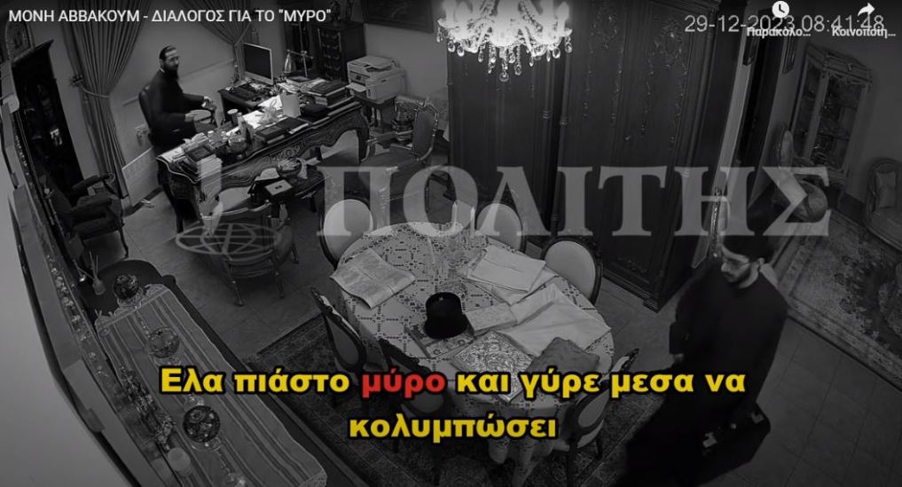 Το βίντεο καταγράφηκε στις 29 Δεκεμβρίου 2023 το πρωί, με τον διάλογο μεταξύ των δύο μοναχών να επικεντρώνεται στην ετοιμασία του «μύρου». Στο πλαίσιο της ετοιμασίας του σταυρού, ακούγεται ο ”Νεκτάριος” να δίνει οδηγίες στον Αββακούμ να βάλει αρκετό «μύρο» στον σταυρό μέχρι να «κολυμπώσει».