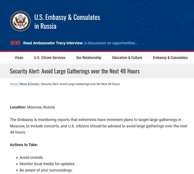 Η πρεσβεία των ΗΠΑ στη Ρωσία συμβούλεψε τους πολίτες των ΗΠΑ να αποφεύγουν τις μεγάλες συγκεντρώσεις για τις επόμενες 48 ώρες στις 7 Μαρτίου, αφού έλαβε πληροφορίες ότι «εξτρεμιστές» σχεδίαζαν επίθεση.. Αντίστοιχη προειδοποίηση υπήρξε και από βρετανική πρεσβεία.