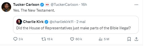 Ο γνωστός Αμερικανός δημοσιογράφος Tucker Carlson/Τάκερ Κάρλσον που πήγε πρόσφατα στη Μόσχα και πήρε συνεντεύξεις τόσο από Πούτιν όσο και από τον Α. Ντάγκιν χθες διαβεβαίωνε ότι η Βουλή των Αντιπροσώπων των ΗΠΑ με το νόμο που πέρασε για αντισημιτισμό καθιστά την Καινή Διαθήκη παράνομη! Την ίδια δήλωση έκανε κι ο Βρετανός μαχητικός βουλευτής των Εργατικών George Galloway! Αν δεν είναι αυτή η εποχή του Αντίχριστου τότε ποια είναι;