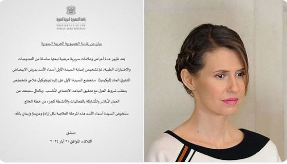 Η Προεδρία της Αραβικής Δημοκρατίας της Συρίας ανακοίνωσε σήμερα ότι μετά την εμφάνιση πολλών κλινικών συμπτωμάτων και σημείων, ακολουθούμενων από μια σειρά ιατρικών εξετάσεων και εξετάσεων, η Πρώτη Κυρία, Asmaa al-Assad, πάσχει από λευχαιμία.