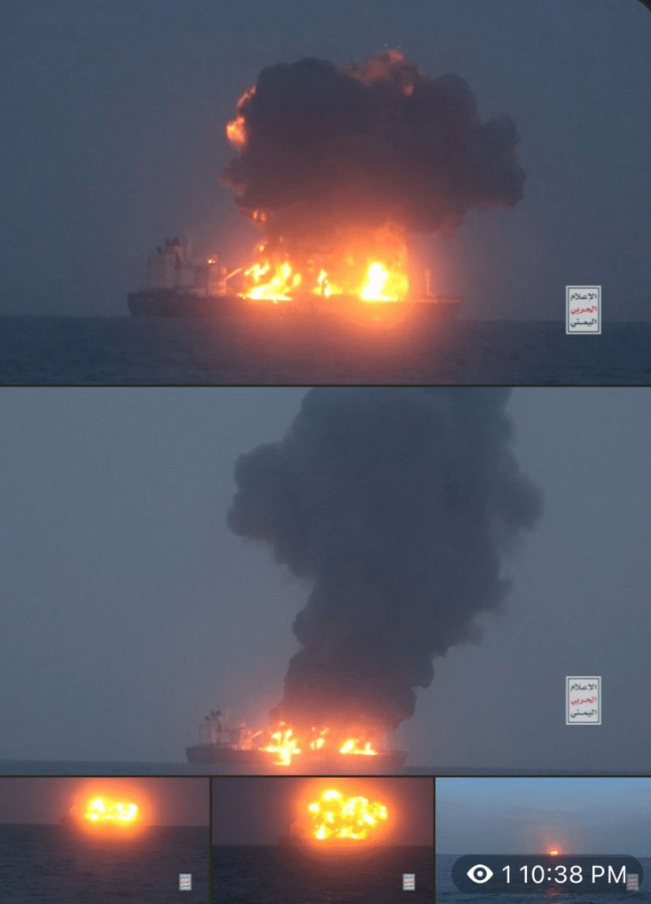 ”Μέσα ενημέρωσης που συνδέονται με την ομάδα Ansar Allah/ Houthis στην Υεμένη μετέδωσαν σκηνές από αυτό που είπαν ότι ήταν «η πυρπόληση ενός ελληνικού πλοίου ”ΣΟΥΝΙΟΝ” στην Ερυθρά Θάλασσα που παραβίασε την απόφαση για απαγόρευση εισόδου στα λιμάνια της κατεχόμενης Παλαιστίνης».” ΛΑΜΠΑΔΙΑΣΕ το τάνκερ διασώθηκε το πλήρωμα αφού το εγκατάλειψε εγκαίρως. Το 25 μελές πλήρωμα διασώθηκε από πλοίο γαλλικής αποστολής.Το SOUNION μετέφερε 150.000 τόνους αργού πετρελαίου
