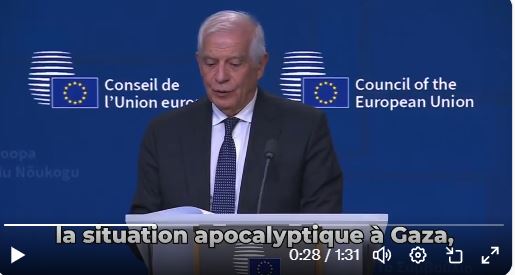 Ως και ο Ζοζέπ Μπορέλ ο Ύπατος εκπρόσωπος της Εξωτερικής πολιτικής της ΕΕ καταγγέλει Αποκάλυψη στη Γάζα. ”Αποκαλυπτική κατάσταση στη Γάζα όπου το 70% των θυμάτων είναι γυναικόπαιδα. Στο Λίβανο 100.000 σπίτια καταστράφηκαν. Η πιο κοινή ηλικία των θυμάτων στη Γάζα από τους βομβαρδισμούς του Ισραήλ είναι 5 ΕΤΩΝ. Αυτός είναι ένας πόλεμος κατά των παιδιών.”