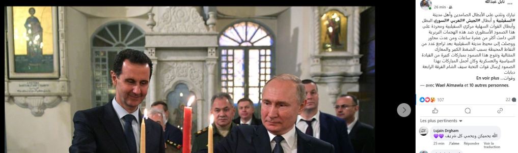 Ευλογούμε και επαινούμε τους σταθερούς ήρωες και τον λαό της πόλης Al-Suqaylabiyah, τους ήρωες του ηρωικού συριακού αραβικού στρατού και τους ήρωες των δυνάμεων της Σαχελίας, των κέντρων της Al-Suqaylabiyah και της Mahardah, για αυτή τη θρυλική αντίσταση ενάντια σε αυτές τις βάρβαρες επιθέσεις που διήρκεσαν περισσότερες από δέκα ώρες, και από πολλούς άξονες που έφτασαν στην περιοχή της πόλης Al-Suqaylabiyah μετά την υποχώρηση ορισμένων γύρω σημείων λόγω μεγάλης πίεσης και διαδοχικών μαχών, και αυτή η αντίσταση που στέφθηκε με επιτυχία με τις μεγάλες ευλογίες από την πολιτική και στρατιωτική ηγεσία . Οι πιο όμορφες ευλογίες για αυτή τη αντίσταση ήταν η αποστολή των επίλεκτων δυνάμεων, της Μεραρχίας Saif al-Sham και τα τανκς