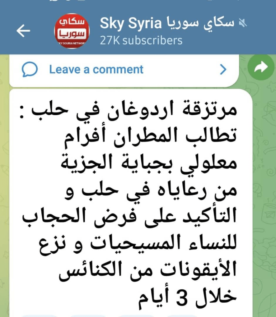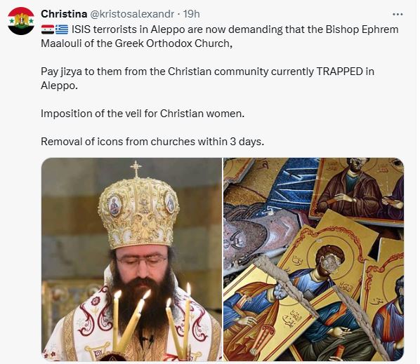 Ανεπιβεβαίωτο. Οι τζιχαντιστές επέδωσαν τελεσίγραφο 3 ημερών στον Μητροπολίτη Χαλεπίου να μαζέψει κεφαλικό φόρο από χριστιανούς, να επιβάλει χιτζάμπ στις χριστιανές και ν΄αφαιρέσει εικόνες από ναούς! ..