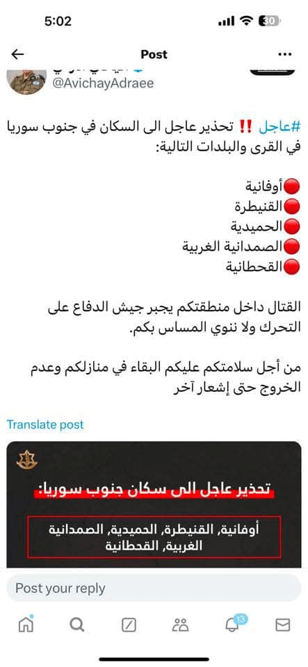 Μια επείγουσα ισραηλινή προειδοποίηση προς τους κατοίκους στη νότια Συρία στα ακόλουθα χωριά και πόλεις: