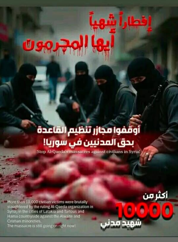 “Αξιόπιστα στοιχεία αναφέρουν 7.000 σφαγές Χριστιανών και Αλαουιτών και πρωτοφανείς θηριωδίες σε αμάχους. Χριστιανικές και άλλες κοινότητες με υπεχιλετή παρουσία στα μέρη αυτά κινδυνεύουν με αφανισμό. Το νέο ισλαμικό καθεστώς οδηγεί τη Συρία σε ένα ισλαμικό κράτος και προφασίζεται ότι δεν μπορεί να ελέγξει τους παραστρατιωτικούς και τις συνδεδεμένες με αυτούς συμμορίες που επιτίθενται κατά αθώων πολιτών.”