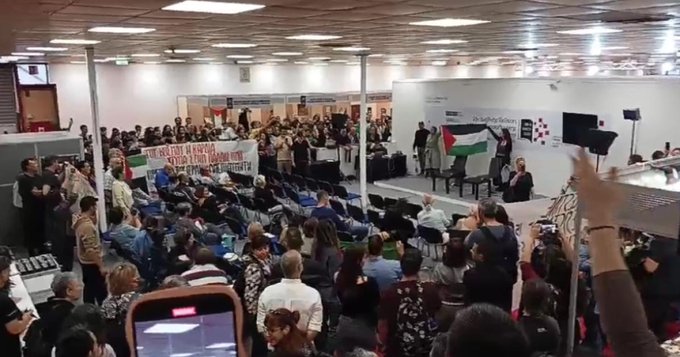 Διαμαρτυρία εργαζομένων, φοιτητών και αλληλέγγυων προς το λαό της Παλαιστίνης έγινε μέσα στο χώρο και οδήγησε στην ακύρωση της εκδήλωσης.