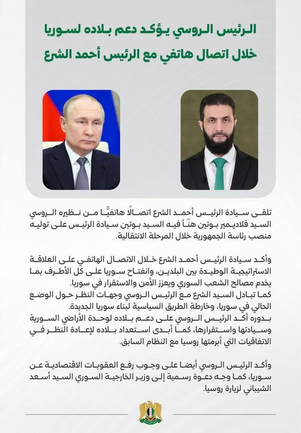 Πρόεδρε της Ρωσίας Βλαντιμίρ Πούτιν… Μετά τη μεγάλη καταστροφή που έπληξε τη χώρα μου, η οποία κατέληξε στην πτώση της τη μαύρη μέρα της 8ης Δεκεμβρίου… Και αφού όλος ο κόσμος συνωμότησε εναντίον αυτής της μικρής, αγαπητής και αξιοπρεπούς πατρίδας… Και το πέπλο σηκώθηκε εντελώς από τα μάτια μας από το θανατηφόρο χαστούκι που δεχθήκαμε… Εμείς, οι έντιμοι Σύριοι, συμπεριλαμβανομένου και εμού, οι φτωχοί εν Θεώ αλλά πλούσιοι στη Συρία, έχουμε χάσει την ικανότητά μας να συγχωρούμε… Ναι… έχουμε χάσει την ικανότητά μας να συγχωρούμε εσένα, εσένα που μας πρόδωσες και μας μαχαίρωσες όχι μόνο πισώπλατα, αλλά και στην καρδιά μας, στα βάθη της καρδιάς μας… Εσύ συγκεκριμένα… αν αυτός ο ουρανός κατέβει σε αυτή τη γη… δεν θα σε συγχωρήσουμε… Όσο κι αν σε αγαπούσαμε πριν, όσο κι αν σε εμπιστευόμασταν... Ω, άνθρωπέ μου, σε ονομάσαμε: Αμπού Αλί Πούτιν. Σε θεωρούσαμε Σύριο σαν εμάς, από την ανώτερη γειτονιά μας, τους γείτονές μας, τους γιους μας στον στρατό, τους πατέρες μας, τους πρεσβύτερούς μας… Αμπού Αλί Πούτιν, αγαπημένε της καρδιάς Αγαπητέ… Όσο κι αν αυτή η αγάπη και η εμπιστοσύνη… Σήμερα σε μισούμε και μισούμε το όνομά σου, την εμφάνισή σου, την ψυχρότητά σου, τη σκληρότητά σου, την απάτη σου, τα ψέματά σου, την προδοσία σου και την προδοσία σου… Και όσο κι αν αυτή η προηγούμενη αγνή αγάπη έχει μετατραπεί στο ιερό μας μίσος σήμερα… δεν θα σε συγχωρήσουμε. Εσένα συγκεκριμένα… δεν θα σε συγχωρήσουμε… Δεν θα σε συγχωρήσουμε…