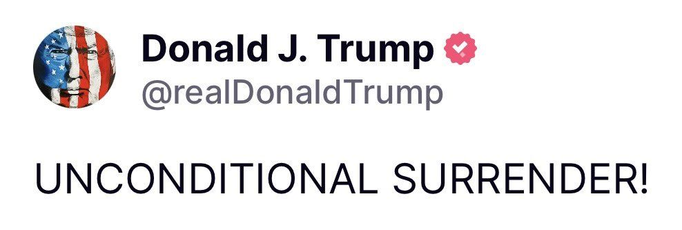 O Τραμπ τουίταρε στο Χ “άνευ όρων παράδοση” εννοώντας το Ιράν αλλά τελικά γλώσσα λανθάνουσα λέει την αλήθεια αναφορικά με την δικιά του άνευ όρων παράδοση στο σιωνισμό.