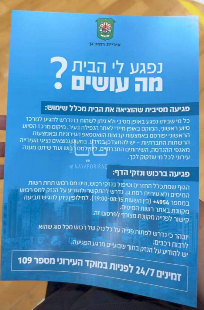 Ο φορέας που χειρίζεται τις επιστροφές χρημάτων και τις ζημιές σε περιουσιακά στοιχεία είναι η Υπηρεσία Φόρου Ακινήτων της Φορολογικής Αρχής και όχι ο Δήμος Ramat Gan. Υποχρεούστε να καλέσετε και να δηλώσετε τη ζημιά από τον φόρο ακίνητης περιουσίας στο *4954 (μεταξύ 7:00 μ.μ. και 8:15 π.μ.). Εναλλακτικά, μπορείτε να υποβάλετε αίτηση ηλεκτρονικά στον ιστότοπο της Φορολογικής Αρχής.