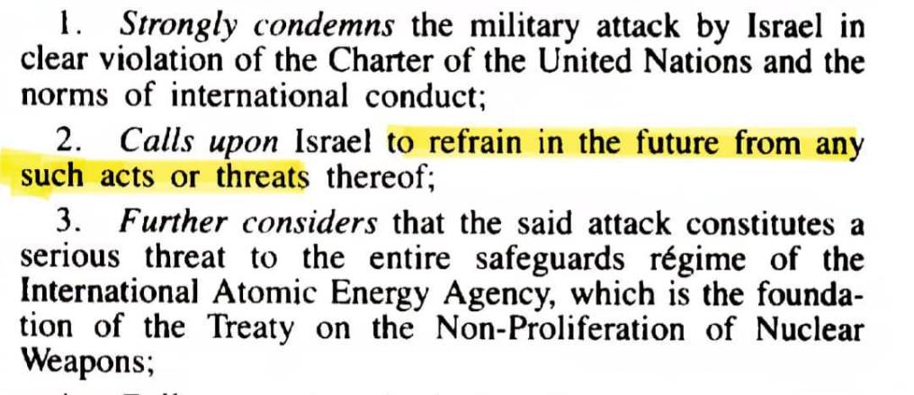 - Καλεί το Ισραήλ να απέχει στο μέλλον από οποιεσδήποτε τέτοιες πράξεις ή απειλές σχετικών πράξεων.