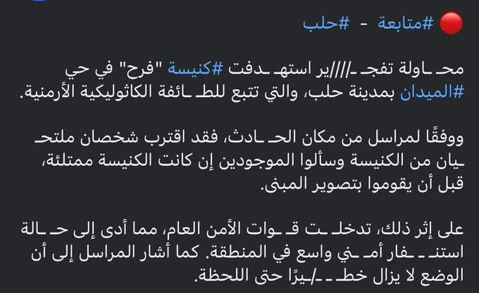 Όπου ένα τρομοκρατικό στοιχείο που συνδέεται με τη Γενική Ασφάλεια διέπραξε ένα αποτρόπαιο έγκλημα στη γειτονιά Μαρ Τάκλα στην πόλη Λατάκια, όπου ο φρουρός της Εκκλησίας Μαρ_Τάκλα πυροβολήθηκε και μαρτύρησε με επτά σφαίρες. …