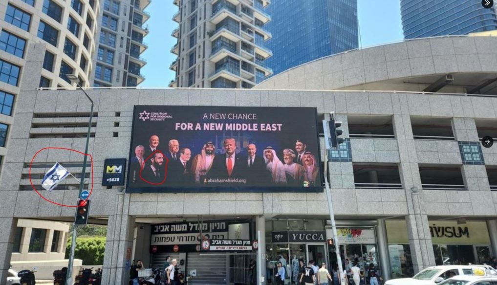 Αποκαλυπτήρια, ο σιωνισμός έριξε τον Άσαντ.. Υψώσαν τον Τζουλάνι στο Τελ Αβίβ…. Η διαφημιστική πινακίδα των Συμφωνιών του Αβραάμ στο Τελ Αβίβ απεικονίζει τους προέδρους του Λιβάνου και της Συρίας τον Τζουλάνι τον αρχηγό της Αλ Κάιντα, καθώς και τον MBS, τον βασιλιά της Σαουδικής Αραβίας. Με το σύνθημα ”μια νέα ευκαιρία για μια Νέα Μέση Ανατολή”..αλί και τρις αλί..