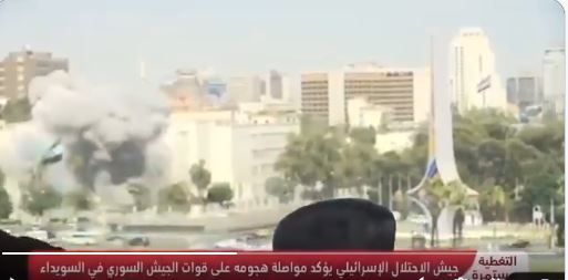 TΩΡΑ 3.30 μμ μεσημέρι Τετάρτης και το Ισραήλ βομβάρδισε για δεύτερη φορά το ΓΕΣ [το ψευδο-αρχηγείο του Γενικού Επιτελείου] του Τζουλάνι στη Δαμασκό στην πλατεία Umayyad και μάλιστα on camera.Περιοχή του ψευδοΥπ. Άμυνας βομβαρδίστηκε. Νωρίτερα είχε βομβαρδίσει την πύλη του. Τώρα μαζικός βομβαρδισμός της IDF σε Δαμασκό.. το αρχηγείο του Γενικού Επιτελείου