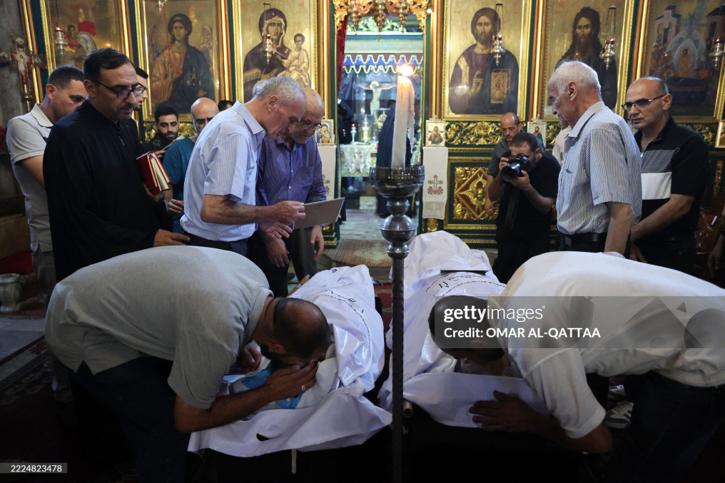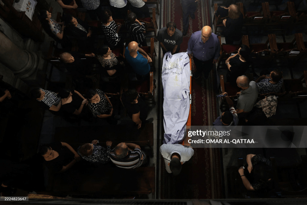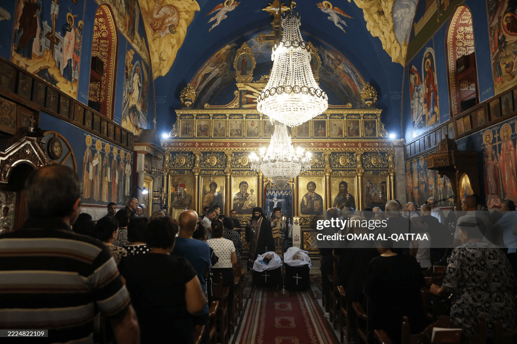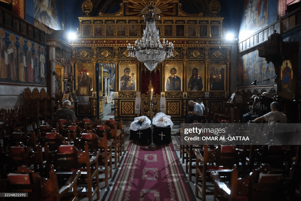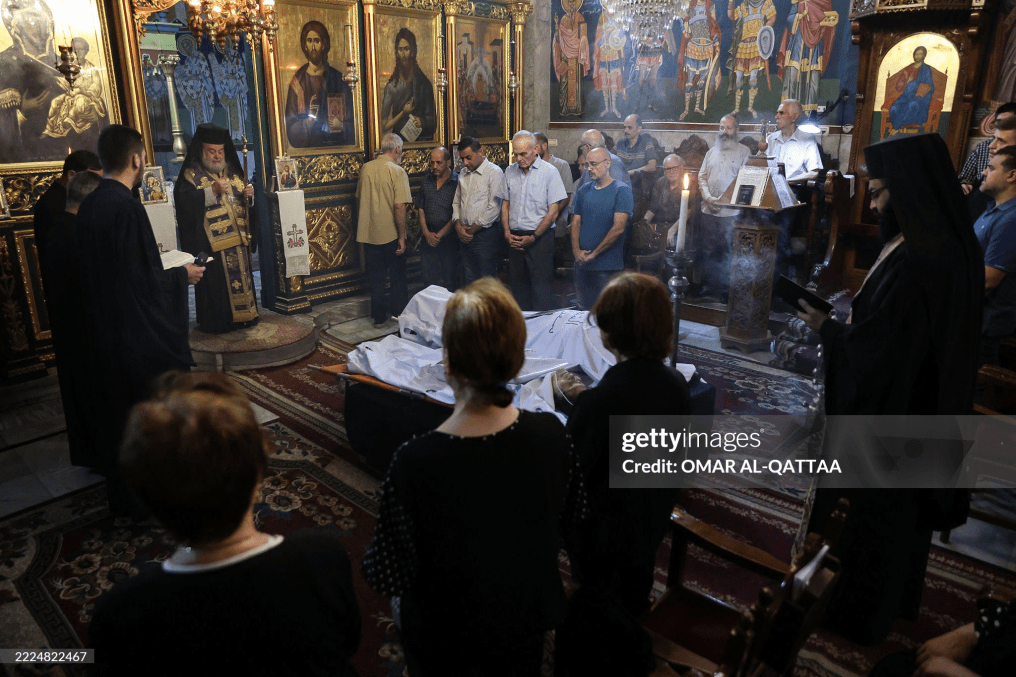 Πενθούντες Παλαιστίνιοι Χριστιανοί παρευρίσκονται στην τελετή κηδείας των Saad Salameh και Foumia Ayyad, που σκοτώθηκαν νωρίτερα σε ισραηλινή επιδρομή που έπληξε την εκκλησία της Αγίας Οικογένειας στην πόλη της Γάζας, καθώς ο Αρχιεπίσκοπος Αλέξιος της εκκλησίας του Αγίου Πορφυρίου χοροστατεί της νεκρώσιμηας ακολουθίας στις 17 Ιουλίου 2025. Μια ισραηλινή επιδρομή στη μοναδική καθολική εκκλησία της Γάζας σκότωσε τρεις ανθρώπους στις 17 Ιουλίου, δήλωσε το Λατινικό Πατριαρχείο Ιεροσολύμων, ενώ το Ισραήλ δήλωσε ότι «ποτέ δεν στοχεύει» θρησκευτικούς χώρους και λυπάται για οποιαδήποτε βλάβη σε πολίτες. Ψεύδεται ασύστολα σκότωσε 20 και πλεόν Ορθόδοξους χριστιανούς όταν βομβάρδισε το ναό Αγίου Πορφυρίου στη Γάζα. Κατ ΄εξακολούθηση φονιάδες Ορθοδόξων χριστιανών..