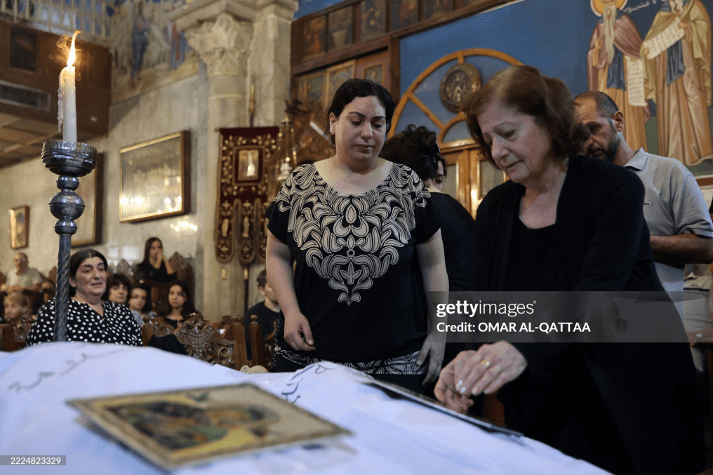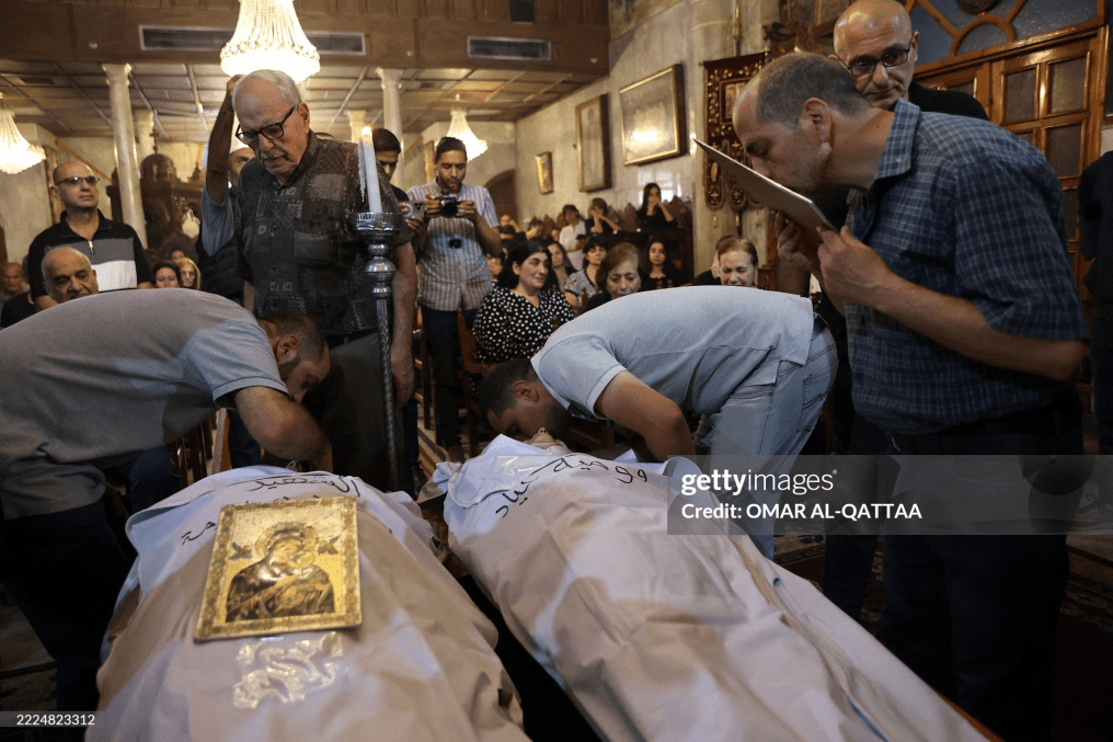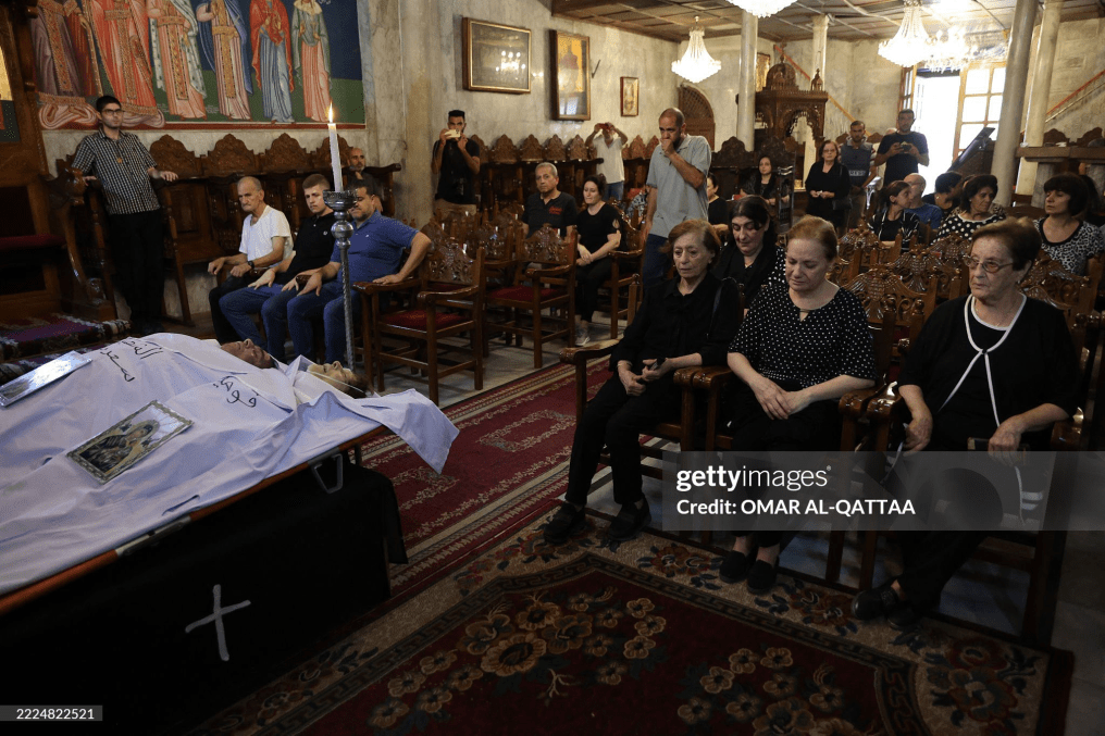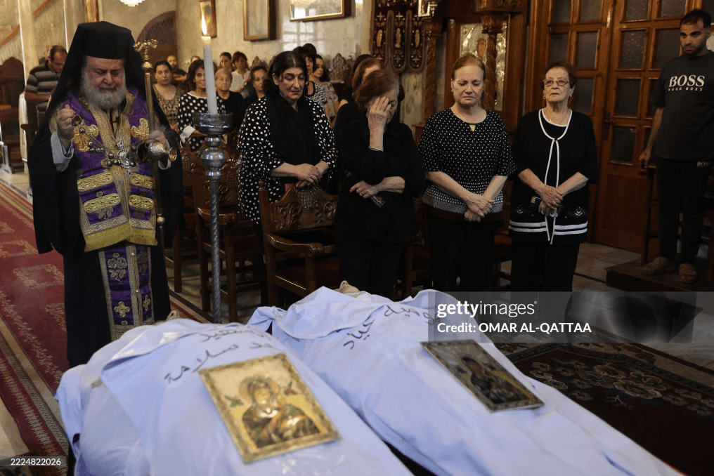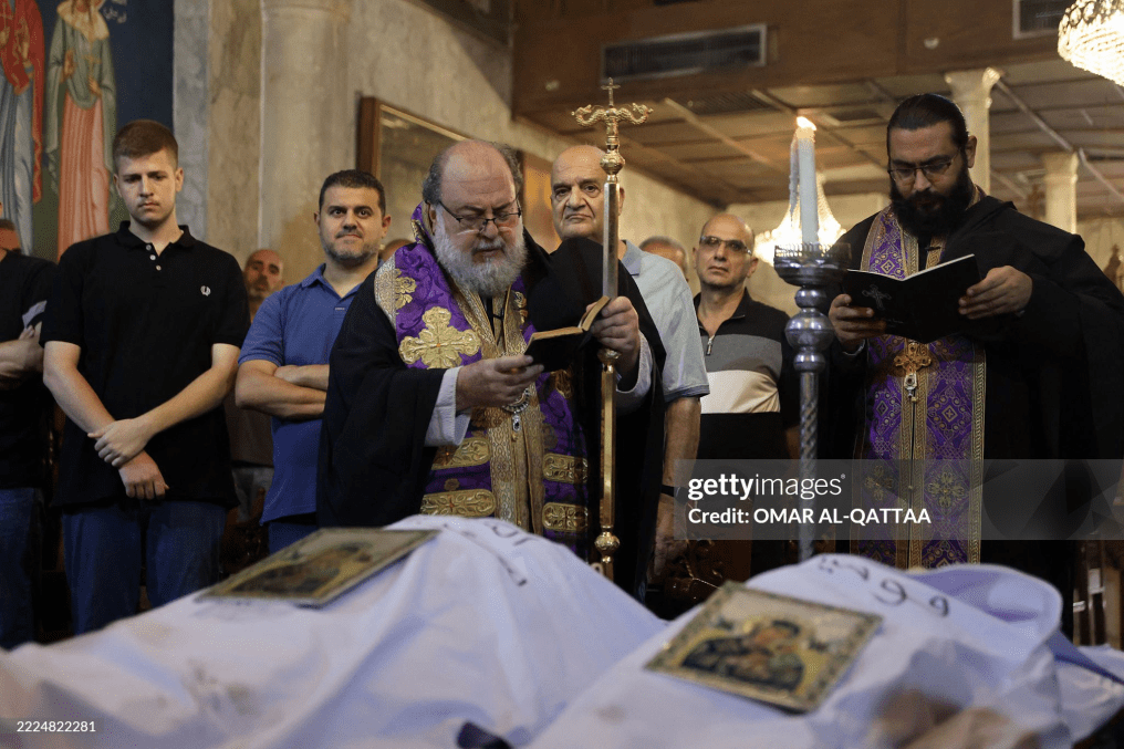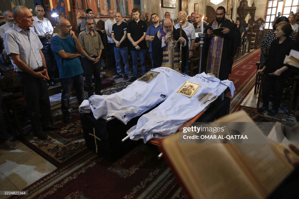 Πενθούντες Παλαιστίνιοι Χριστιανοί παρευρίσκονται στην τελετή κηδείας των Saad Salameh και Foumia Ayyad, που σκοτώθηκαν νωρίτερα σε ισραηλινή επιδρομή που έπληξε την εκκλησία της Αγίας Οικογένειας στην πόλη της Γάζας, καθώς ο Αρχιεπίσκοπος Αλέξιος της εκκλησίας του Αγίου Πορφυρίου χοροστατεί της νεκρώσιμηας ακολουθίας στις 17 Ιουλίου 2025. Μια ισραηλινή επιδρομή στη μοναδική καθολική εκκλησία της Γάζας σκότωσε τρεις ανθρώπους στις 17 Ιουλίου, δήλωσε το Λατινικό Πατριαρχείο Ιεροσολύμων, ενώ το Ισραήλ δήλωσε ότι «ποτέ δεν στοχεύει» θρησκευτικούς χώρους και λυπάται για οποιαδήποτε βλάβη σε πολίτες. Ψεύδεται ασύστολα σκότωσε 20 και πλεόν Ορθόδοξους χριστιανούς όταν βομβάρδισε το ναό Αγίου Πορφυρίου στη Γάζα. Κατ ΄εξακολούθηση φονιάδες Ορθοδόξων χριστιανών..