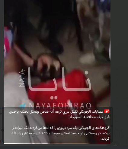 Συμμορίες του Αλ-Τζoυλάνι σκότωσαν έναν Δρούζο, τον οποίο ισχυρίστηκαν ότι ήταν ελεύθερος σκοπευτής, και ακρωτηρίασαν το σώμα του σε ένα χωριό στα περίχωρα του κυβερνείου Αλ-Σουέιντα.