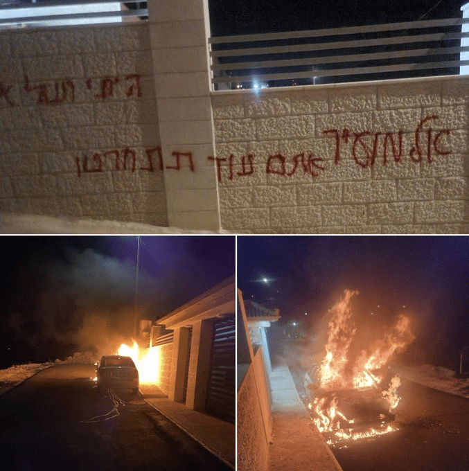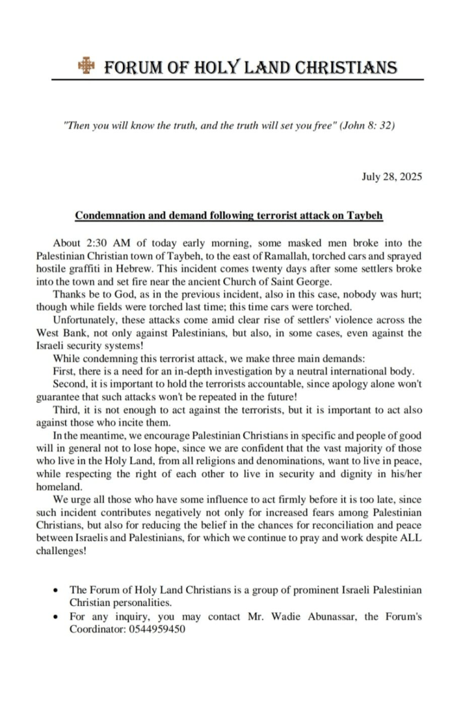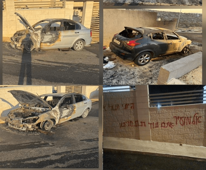 Περίπου στις 2:30 π.μ. σήμερα, αρκετοί μασκοφόροι έποικοι εισέβαλαν στην παλαιστινιακή χριστιανική πόλη Ταϊμπέχ, ανατολικά της Ραμάλα, βάζοντας φωτιά σε αυτοκίνητα και γράφοντας εχθρικά συνθήματα στα εβραϊκά. Αυτή η επίθεση έρχεται μόλις είκοσι ημέρες αφότου οι έποικοι εισέβαλαν στην πόλη και έβαλαν φωτιά κοντά στην ιστορική εκκλησία του Αγίου Γεωργίου.