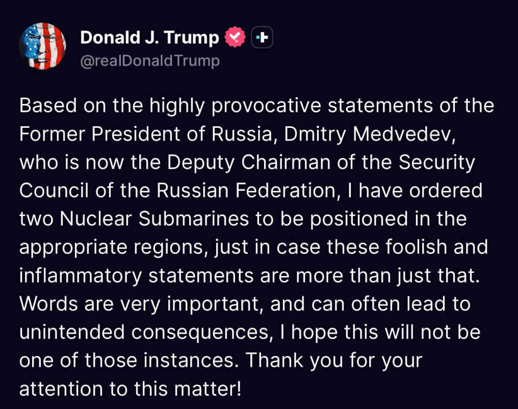 Trump: ”Με βάση τις πολύ προκλητικές δηλώσεις του τ. Προέδρου Ρωσίας Ντμίτρι Μεντβέντεβ που είναι τώρα ο Αν.Προεδρος του Εθνικού Συμβουλίου Ασφάλειας Ρώσικης Ομοσπονδίας διέταξα 2 πυρηνικά υποβρύχια να σταθμεύσουν σε ανάλογες περιοχές (όπα Τραμπ πλάκα κάνει ο Ντμίτρι είναι χωρατατζής δεν εννοεί τίποτα από όσα λέει, έλεος μην αρπάζεσαι) σε περίπτωση που αυτές οι ανόητες και εμπρηστικές δηλώσεις είναι κάτι περισσότερο από αυτό. Oι λέξεις είναι πολύ σημαντικές και συχνά μπορεί να οδηγήσουν σε ακούσιες συνέπειες.Ελπίζω ότι αυτή δεν είναι μια τέτοια περίπτωση.Eυχαριστώ για την προσοχή σου σε αυτή την υπόθεση.”