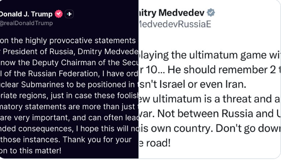 ”Ο Τραμπ διέταξε την τοποθέτηση δύο πυρηνικών υποβρυχίων κοντά στη Ρωσία. Το εξήγησε αυτό με τις «εξαιρετικά προκλητικές δηλώσεις» του Ντμίτρι Μεντβέντεφ.