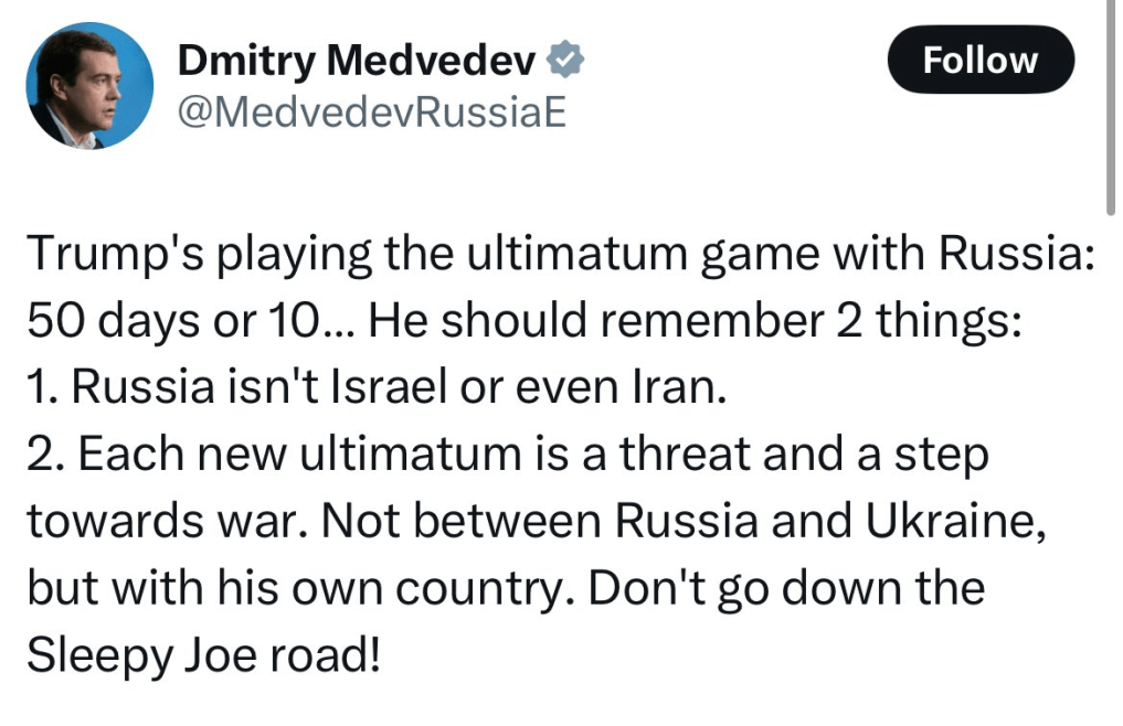 - Kάθε νέο τελεσίγραφο είναι μια απειλή και ένα βήμα προς τον πόλεμο. όχι ανάμεσα σε Ρωσία Ουκρανία αλλά με τη δική του χώρα (σιγά τα αίματα ρε Μεντβέντεβ βάλατε την ουρά στα σκέλια και λακίσατε σαν κλέφτες νύχτα από Συρία γιατί κλάσατε μαλλί σε 5 κατσαπλιάδες του Ερντογάν, λέγατε πάτε για Κίεβο και αμύνεσθαι περί πάτρης στο Κουρσκ σε ρωσικό έδαφος.. κούλαρε οι δηλώσεις σου πάντα ήταν μαξιμαλιστικές όλο πατάτε το κουμπί των πυρηνικών πάθατε αγκύλωση από το πάτημα. Το Ισραήλ το ρωτήσατε; Αφού για τα ισραηλινά συμφέροντα κατά Ιράν παραδώσατε το Αρτσάκχ σε Αζέρους για τα ισραηλινά συμφέροντα διαλύσατε τη Συρία για τα ισραηλινά συμφέροντα δεν φτάσατε ποτέ στο Παγκόσμιο κέντρο σιωνισμού τη Οδησσό και μάλιστα παραδώσατε και Χερσώνα άνευ μάχης για να μην γίνονται συνειρμοί, για ισραηλινά συμφέροντα έμειναν από καύσιμα τα ρώσικα τανκ έξω από το Κίεβο για να γίνει ήρωας από το πουθενά ο Εβραίος γελωτοποιός ο Ζελένσκι κ.α) Mην σε παίρνει ο ύπνος Joe στο τιμόνι!”