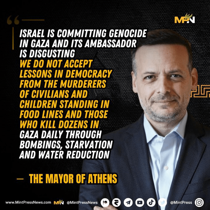 Προηγήθηκε η κόντρα του Δημάρχου της Αθήνας Χάρη Δούκα με τον Ισραηλινό πρέσβη που κάνει το γύρο του κόσμου όπου ο πρώτος κατηγόρησε την Αθήνα για αντισημιτικά γκράφιτι στους τοίχους της κι ο Δούκας ανταπάντησε ότι ”δεν δεχόμαστε μαθήματα δημοκρατίας από αυτούς που σκοτώνουν παιδιά”.