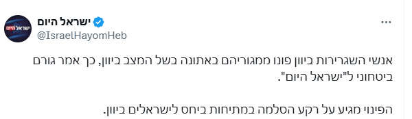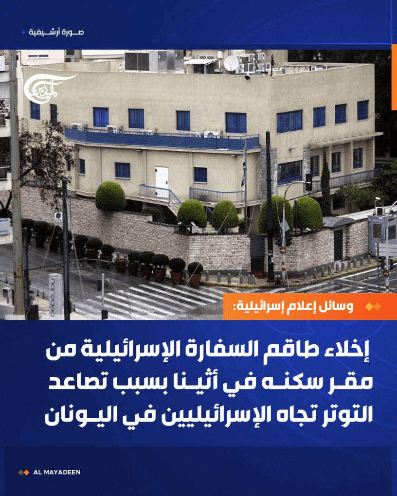 ”Το προσωπικό της πρεσβείας στην Ελλάδα εκκενώθηκε από την έδρα του στην Αθήνα λόγω της κατάστασης στην Ελλάδα, δήλωσε πηγή ασφαλείας στο Israel Hayom* .Η εκκένωση από την Αθήνα επέρχεται εν μέσω αυξανόμενων εντάσεων σχετικά με τους Ισραηλινούς στην Ελλάδα” αναφέρει τώρα το αντίστοιχο μέσο.