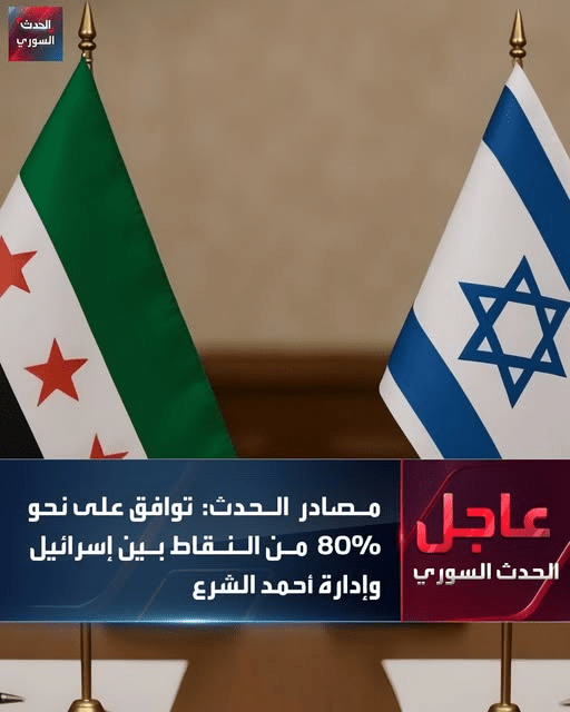 Επιτεύχθηκε συμφωνία για περίπου το 80% των σημείων μεταξύ του Ισραήλ και της ψευδοκυβέρνησης Αχμάντ Αλ-Σαράα στις διμερείς συνομιλίες στο Παρίσι μεταδίδει το al hadath.