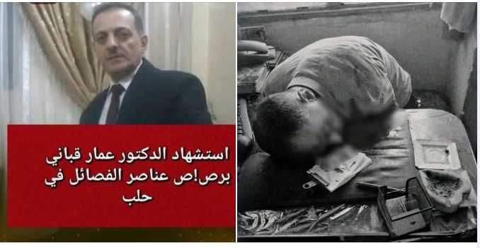 Oι ανθρωποφύλακες του Τζουλάννι δολοφόνησαν εν ψυχρώ στο γραφείο του στην κλινική του το γιατρό Dr. Ammar Qabbani στο Χαλέπι στο Bustan al-Qasr. Eπαναλαμβάνουν το έγκλημα στο νοσοκομείο της Σουέιντα.. Αυτοί είναι οι σύμμαχοί μας.. Τον έχουν γαζώσει εμφανή τα τραύματα από σφαίρες κόσκινο ο γιατρός από τους φίλους μας..