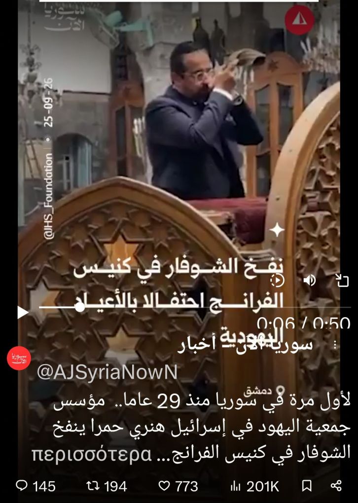 Για πρώτη φορά στη Συρία μετά από 29 χρόνια, ο Χένρι Χάμρα, ιδρυτής του Συνδέσμου Εβραίων στο Ισραήλ, σαλπίζει το σοφάρ στη Συναγωγή Φράντζ στη Δαμασκό με την ευκαιρία του Ρος Χασανά και του Γιομ Κιπούρ.