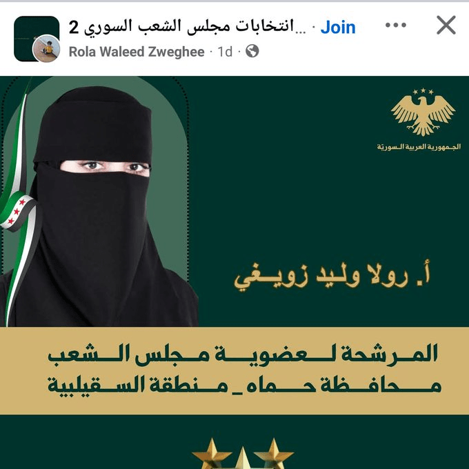 Αυτή η γυναίκα με τη μπούργκα επιλέχθηκε από το καθεστώς του Τζολάνι για να εκπροσωπήσει ως βουλευτής την Ελληνορθόδοξη περιοχή Σελευκόβουλος στη Δυτική Χάμα. Η Αλ Κάιντα προκήρυξε βουλευτικές εκλογές αλλά οι 70 έδρες στις 210 δηλ. το 1/3 καταλαμβάνεται από διορισμένους..Οι υπόλοιποι και πάλι θα πρέπει η υποψηφιότητα τους θα πρέπει να εγκριθεί από εκλογικά σώματα επιτροπές. Που σημαίνει εκλογές οπερέτα όλοι εγκάθετοι..εκλεκτοί του καθεστώτος και μη εκλεγμένοι.