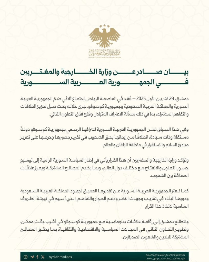 Στις 29 Οκτωβρίου 2025, σε μια οικονομική σύνοδο κορυφής που πραγματοποιήθηκε στη Σαουδική Αραβία στο Ριάντ και μέσω των προσπαθειών/λόμπινγκ αυτής της χώρας, η συριακή κυβέρνηση αναγνώρισε επίσημα την ύπαρξη του Κοσσυφοπεδίου